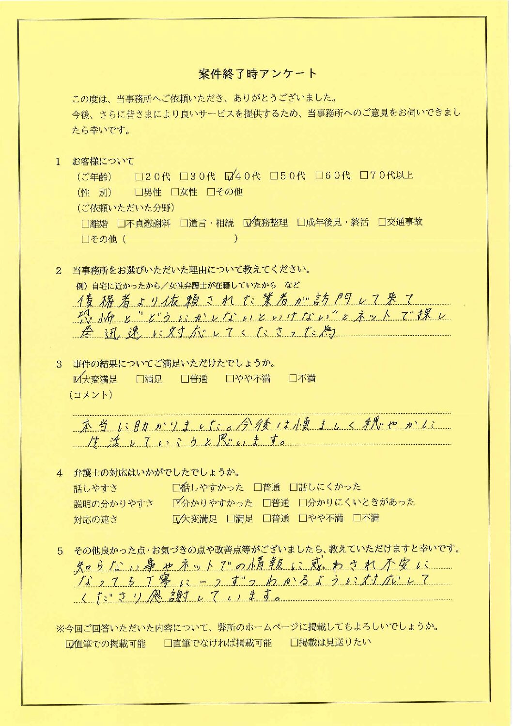 本当に助かりました。今後は慎ましく穏やかに生活していこうと思います。